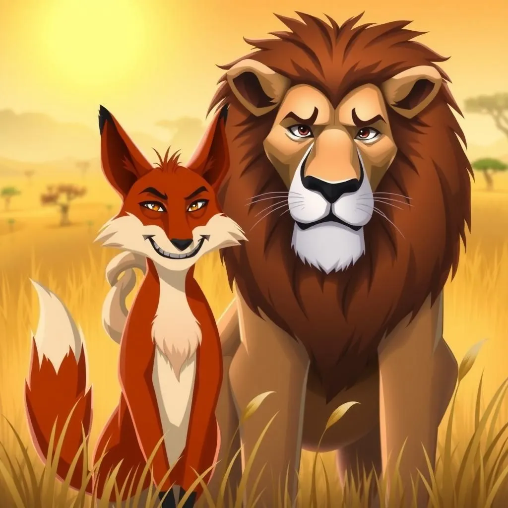 في "الأسد والثعلب"، قصة أخلاقية شيقة، يتعاون الثعلب مع الأسد، حيث يساعده في تحديد الفريسة بينما يقوم الأسد بالتقاطها. وبسبب الغيرة من نصيب الأسد، يقرر الثعلب الصيد بمفرده ولكنه يفشل في النهاية ويصبح فريسة للصيادين وكلابهم. هذه القصة الأخلاقية القصيرة واللطيفة تذكر الطلاب بأن الحسد يمكن أن يؤدي إلى هلاك المرء.