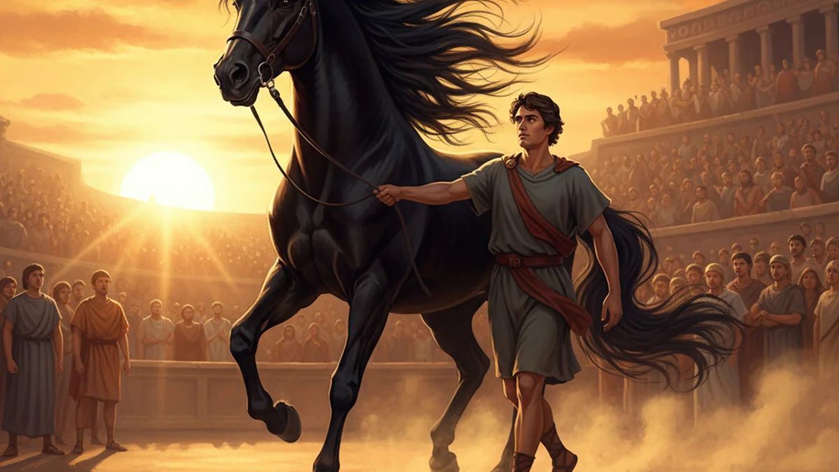King Philip II of Macedon was presented with a magnificent black stallion named Bucephalus, but the horse proved wild and unmanageable. It reared and bucked at any rider, leading the King to order the beast away. His young son, Alexander, watched closely and noticed a detail the others had missed: the horse was terrified of its own shifting shadow. Alexander wagered he could ride the animal. He gently turned Bucephalus toward the sun so the shadow fell behind, out of the horse's sight. Speaking softly, he mounted the stallion and rode him with ease across the field. The crowd fell silent in awe. When Alexander returned, his father wept with pride, famously telling him that Macedonia was too small for his ambition and that he must seek a kingdom worthy of himself.