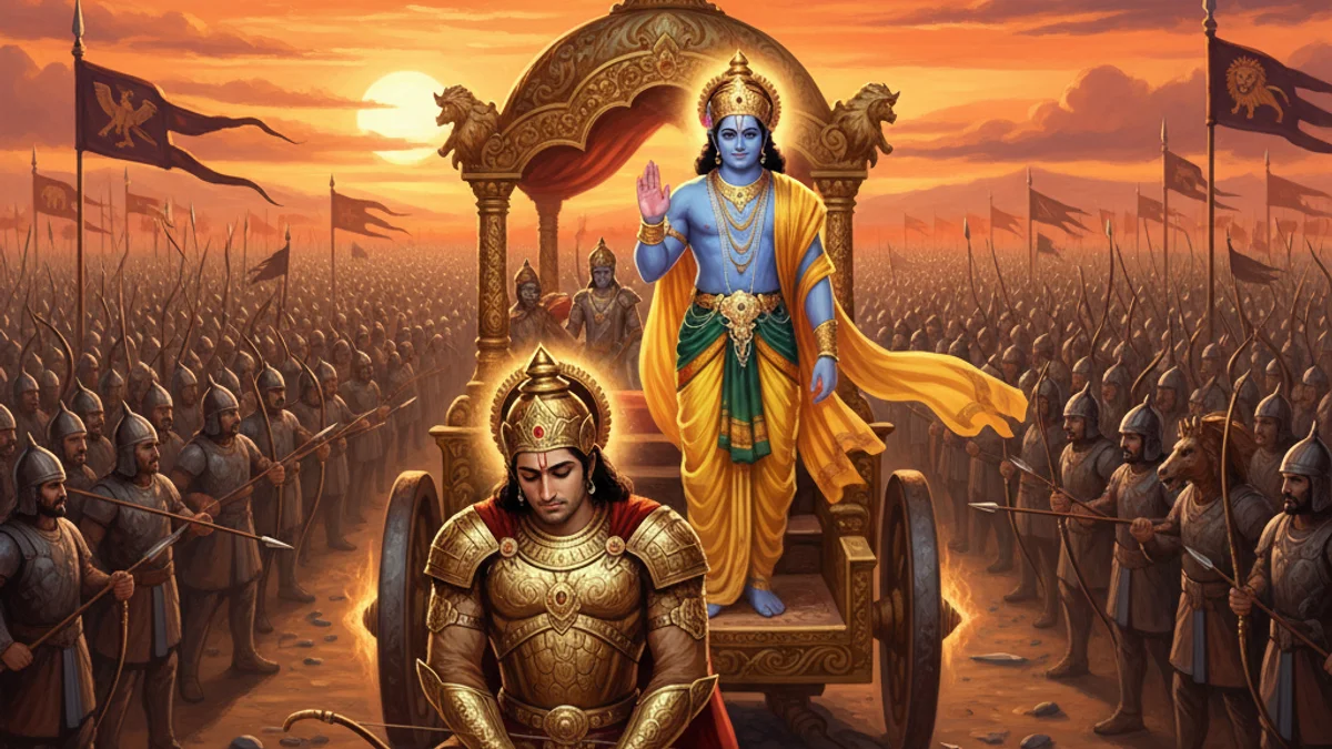 On the vast plains of Kurukshetra, two great armies stood poised for a war that would decide the fate of Bharatavarsha. Arjuna, the peerless archer of the Pandavas, asked his charioteer, Lord Krishna, to drive him to the center of the battlefield. As he looked across the front lines, his heart sank. He did not see enemies; he saw his grandfather Bhishma, his teacher Drona, his cousins, and his friends. Overwhelmed by grief and moral confusion, Arjuna’s limbs trembled, and his legendary bow, Gandiva, slipped from his hands. He declared he would rather live as a beggar than shed the blood of his kin. It was in this moment of profound despair that Krishna began his divine discourse, the Bhagavad Gita. Krishna reminded Arjuna that as a warrior, his 'Dharma' or righteous duty was to fight against injustice, regardless of personal attachments. He taught that the soul is eternal and cannot be killed, and that performing one's duty without attachment to the results is the highest path to spiritual liberation. Reassured by this wisdom, Arjuna picked up his bow, his resolve restored to fight for righteousness.