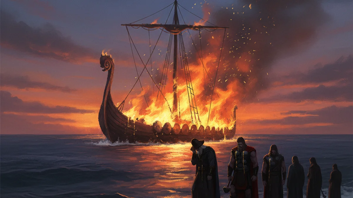 Experience the sorrow of Baldur's Funeral, where the Aesir mourn their beloved god of light. Witness the burning ship Hringhorni as it sails toward the afterlife.