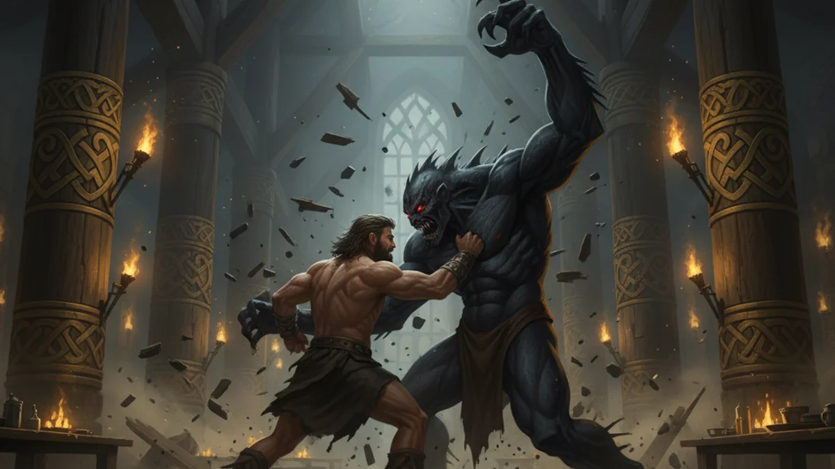 In the kingdom of the Danes, King Hrothgar built a magnificent mead hall called Heorot, a place of joy and song. But the clamor of celebration tormented Grendel, a monstrous descendant of Cain who dwelled in the nearby marshes. For twelve years, Grendel haunted the hall, snatching and devouring warriors under the cover of night. Hearing of Hrothgar’s plight, the Geatish hero Beowulf sailed across the sea with fourteen brave men. He vowed to purge the evil without the use of a sword, matching the monster's brute strength with his own. That night, as the warriors slept, Grendel burst through the iron-bound doors. Beowulf met him in a titanic struggle, his grip like iron. The hall shook as the hero tore the monster’s arm from its shoulder. Mortally wounded, Grendel fled into the darkness to die, leaving his severed limb as a trophy of Beowulf’s legendary victory.