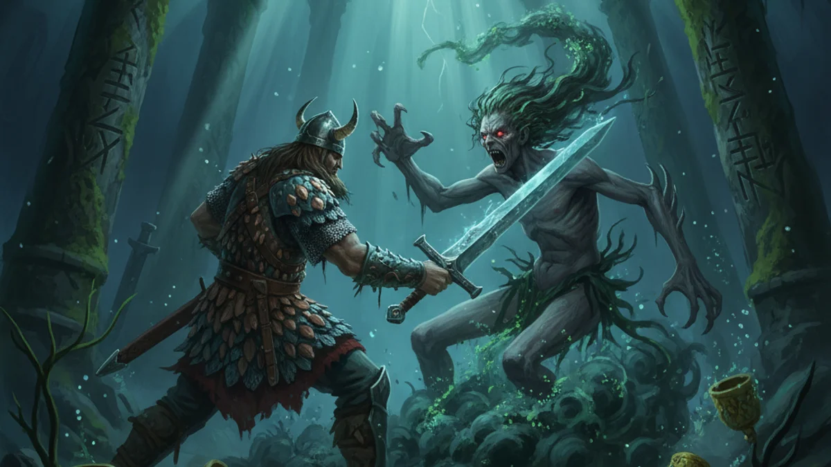 After the hero Beowulf defeated the monster Grendel, peace seemed to return to King Hrothgar’s hall, Heorot. But the peace was short-lived. Driven by a fierce, maternal grief, Grendel’s mother emerged from the murky depths of the moors to avenge her son. She attacked Heorot, slaying the king’s most trusted advisor before retreating to her underwater lair. Determined to end the terror once and for all, Beowulf donned his armor and pursued her. He dove into a cursed, boiling mere, sinking for hours until he reached a cavern at the bottom. There, the monstrous hag lunged at him. Beowulf’s famous sword, Hrunting, failed to pierce her skin. In a desperate moment, he spotted an ancient, massive sword forged by giants hanging on the cave wall. With a surge of superhuman strength, he swung the heavy blade, severing the monster's head. He found Grendel’s corpse nearby, decapitated it as a trophy, and rose to the surface, proving that even the darkest depths cannot hide a monster from a true hero's justice.