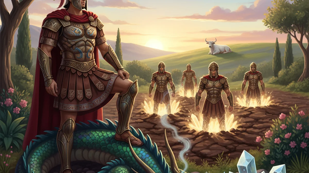 After his sister Europa was spirited away by Zeus, Prince Cadmus of Phoenicia searched the world in vain. Consulting the Oracle at Delphi, he was told to abandon his search and instead follow a cow with moon-shaped markings. Where the animal finally lay down, he was to build a city. Following the beast to the plains of Boeotia, Cadmus prepared a sacrifice but found his men slaughtered by a monstrous dragon guarding a sacred spring of Ares. Cadmus slew the serpent in a fierce battle. Instructed by Athena, he sowed the dragon’s teeth into the earth. From the soil sprang armed warriors, the Spartoi, who fought until only five remained. With these survivors, Cadmus built the citadel of the Cadmeia and founded the great city of Thebes, though he would forever bear the weight of Ares' wrath for killing the sacred beast.