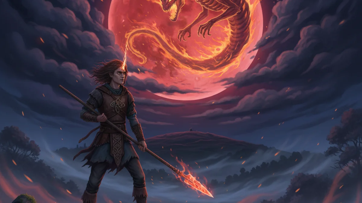 Every Samhain for twenty years, a fire-breathing creature named Aillen the Burner emerged from the Otherworld to destroy the royal palace at Tara. With his enchanted harp, he played music so hauntingly beautiful that it lulled every warrior to sleep, allowing him to incinerate the hall with his breath. The young Fionn mac Cumhaill arrived at Tara and vowed to stop the beast. To resist the magical slumber, Fionn was given a magical spear by Fiacha. As the music began to drift through the air, Fionn pressed the red-hot blade of the spear against his forehead; the stinging pain kept him awake while all others succumbed to sleep. When Aillen appeared to breathe fire, Fionn intercepted the flames with his cloak and chased the creature to the gates of the Otherworld. With a mighty throw, Fionn pierced Aillen through the back, ending the terror. Impressed by his bravery, King Cormac mac Airt granted Fionn his rightful inheritance: the leadership of the legendary Fianna.