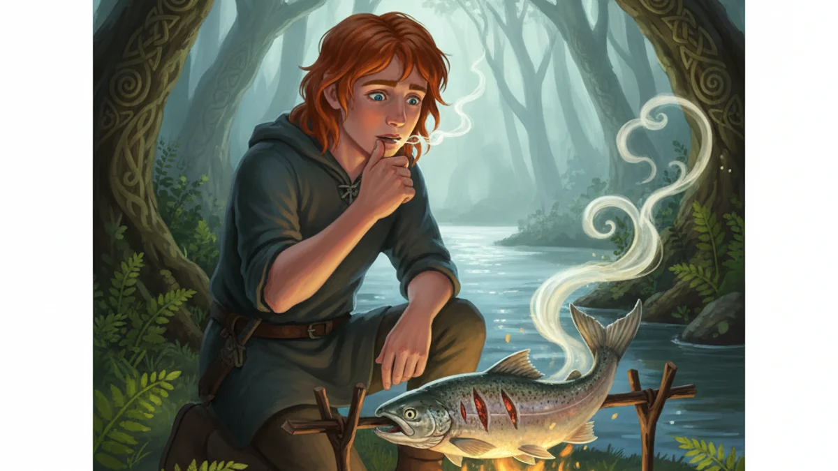 Fionn Mac Cumhaill was a legendary hunter-warrior of Ireland. As a young man, he was sent to study with the druid Finn Eces by the River Boyne. The druid had spent seven years trying to catch the Salmon of Knowledge, for prophecy said that whoever ate it would possess all the wisdom in the world. When he finally caught the fish, he instructed Fionn to cook it but warned him not to eat a single bite. While turning the spit, a drop of hot fat splashed onto Fionn’s thumb. He instinctively sucked his thumb to ease the burn, unintentionally swallowing the salmon's wisdom. Realizing what had happened, Finn Eces gave Fionn the rest of the fish. From that day on, whenever Fionn needed to solve a problem or foresee the future, he simply bit his thumb, and the knowledge of the ages would come to him. He went on to lead the Fianna, protect Ireland from giants, and become its greatest hero.