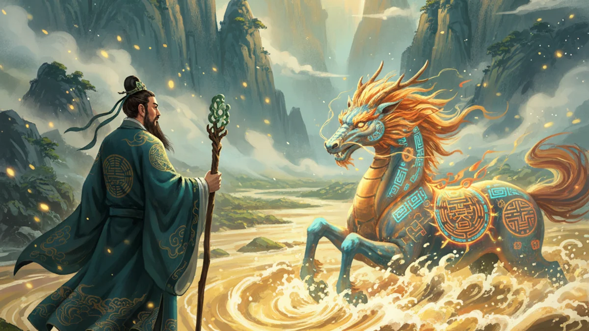 Explore the legend of Fuxi and the Eight Trigrams, a pivotal Chinese myth where a divine dragon horse reveals the secrets of the cosmos to the first sovereign.