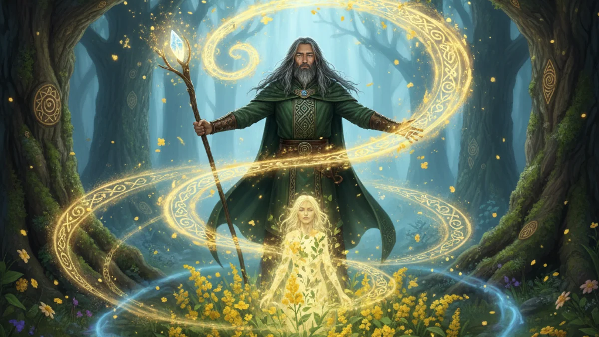 Discover the legend of Gwydion the Magician, the powerful trickster of the Mabinogion who used sorcery to name heroes and create a wife from spring flowers.
