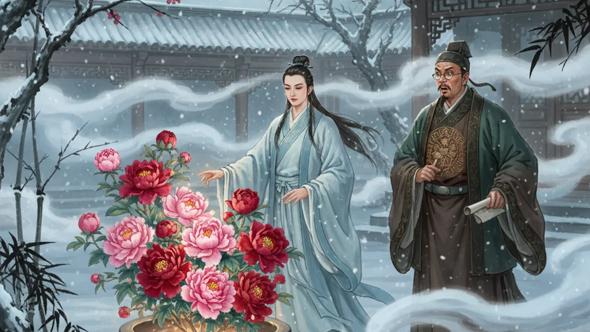 Discover the legend of Han Xiangzi and the Flowers, where the Immortal proves his divine power to the skeptic Han Yu by making peonies bloom in the dead of winter.