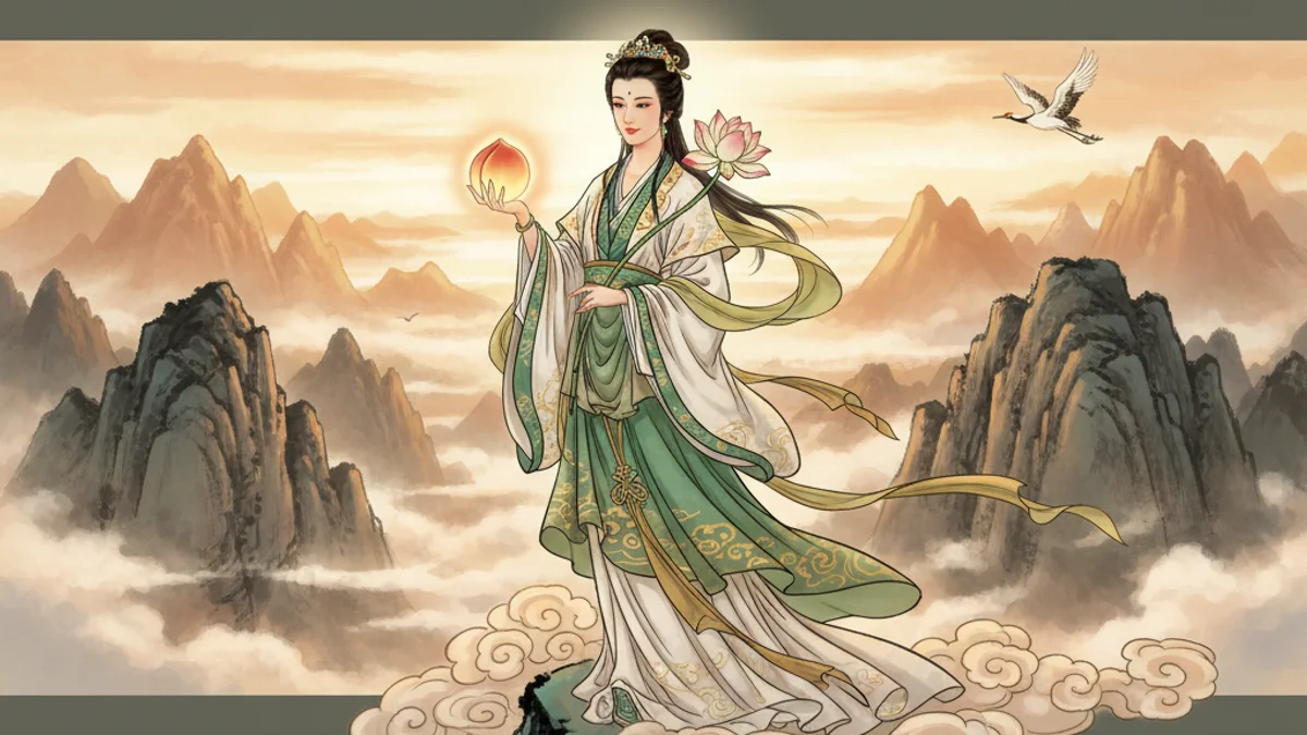 In the lush Yunmu Mountains of the Tang Dynasty lived a young woman named He Xiangu, renowned for her kindness and devotion to her family. One afternoon, while gathering herbs, she encountered the wandering immortal Lü Dongbin. Sensing her pure spirit, he offered her a single, shimmering peach from the celestial gardens of the Queen Mother of the West. Upon taking a bite, He Xiangu felt her body become as light as air and her mind expand with divine clarity. She no longer felt the pangs of hunger or the weight of worldly sorrow. Gifted with the ability to predict the future and fly across the peaks, she spent her days helping the sick and the poor. Eventually, she ascended to the heavens on a golden cloud, taking her place as the only female member of the Eight Immortals, forever carrying a lotus to symbolize her eternal purity.