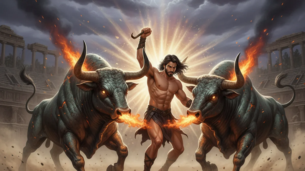 To claim the Golden Fleece, King Aeëtes set Jason a seemingly impossible task: to yoke two bronze-hoofed, fire-breathing bulls known as the Khalkotauroi and plow a sacred field. Realizing the mortal danger Jason faced, the king’s daughter, the sorceress Medea, fell in love with him and offered her secret arts. She provided Jason with a magical ointment made from the Caucasian crocus, which made his skin and armor impervious to fire and steel for a single day. Protected by the balm, Jason entered the arena. As the massive beasts charged, belching torrents of flame, Jason stood his ground, his body unburnt by the searing heat. With divine strength, he wrestled the bulls into submission, forcing them into the yoke. He successfully plowed the field and sowed it with dragon teeth, which instantly sprouted into an army of stone-born warriors. Following Medea's advice, Jason threw a stone among them, causing the soldiers to turn on one another until none remained, completing the king's deadly trial.