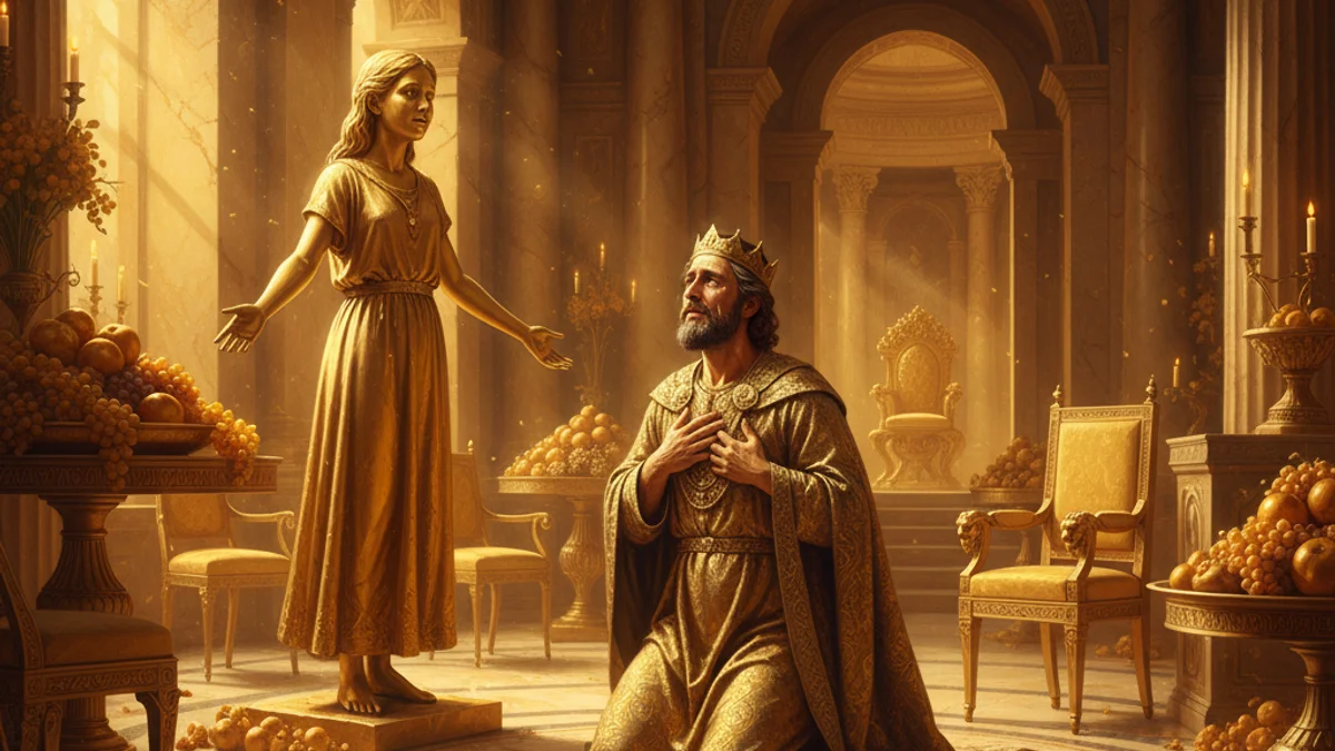 King Midas, a man of immense wealth, was never satisfied. When he performed a kindness for Silenus, the satyr companion of the god Dionysus, he was granted any wish he desired. Driven by avarice, Midas asked that everything he touched be turned into glistening gold. Dionysus reluctantly agreed. At first, Midas was overjoyed, turning stones and flowers into treasure. However, the blessing soon became a nightmare. He could not eat bread or drink wine, for they hardened into metal the moment they touched his lips. In his despair, he hugged his beloved daughter, only to watch her transform into a cold, lifeless statue. Realizing that his greed had cost him his humanity, Midas begged Dionysus for mercy. The god instructed him to bathe in the River Pactolus. Upon doing so, the golden touch left him, and its power flowed into the river sands, leaving Midas to value the simple gifts of life forevermore.