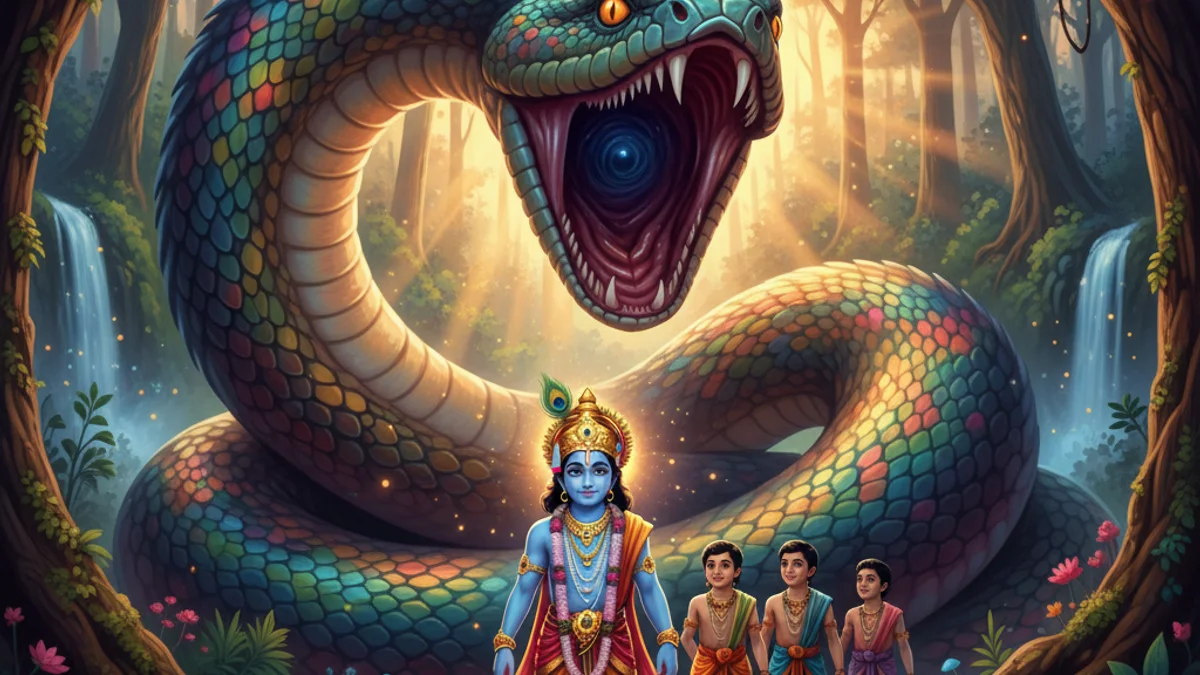 In the tale of Krishna and Aghasura, the young deity saves his friends from a giant serpent demon's mouth, demonstrating divine protection and ultimate mercy.