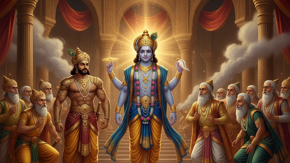 When Duryodhana attempted to capture him, Krishna revealed his Vishwaroopam, or universal form. The court saw the entire cosmos within him, proving his divinity and the futility of trying to bind God.