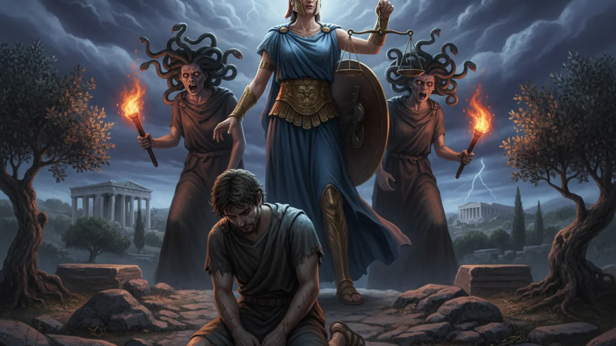 After the Trojan War, King Agamemnon returned home only to be murdered by his wife, Clytemnestra, and her lover. Bound by honor and the command of Apollo, their son Orestes took up the sword and slew his mother to avenge his father. This act of matricide unleashed the Erinyes—the Furies—ancient spirits of vengeance who hounded Orestes to the brink of madness. Seeking refuge, Orestes fled to Athens, where he appealed to the goddess Athena. Recognizing that blood-vengeance could only lead to endless cycles of death, Athena established the Areopagus, the first court of law. A jury of citizens heard the case, but the vote was tied. Athena cast the deciding ballot for mercy, acquitting Orestes. To appease the Furies, she transformed them into the Eumenides, or 'Kindly Ones,' protectors of justice rather than agents of spite.