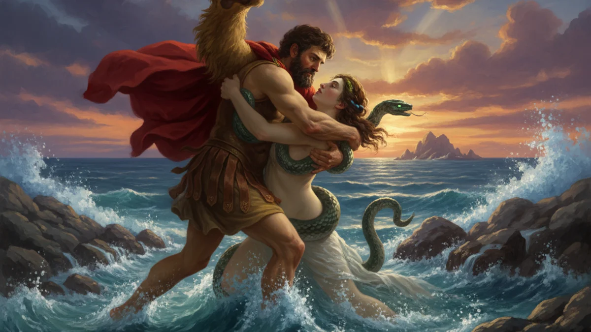 A prophecy once whispered that the sea nymph Thetis would bear a son far greater than his father. This warning deterred even the mighty Zeus and Poseidon, who had both sought her hand. Instead, they decreed that she must marry a mortal, choosing the hero Peleus. To win her, Peleus had to capture the elusive goddess as she lounged on the shores of Magnesia. As he seized her, Thetis used her divine powers to change shape, transforming into a roaring lion, a hissing serpent, a torrent of water, and a blazing fire. Guided by the wise centaur Chiron, Peleus held fast through every terrifying metamorphosis until Thetis finally returned to her true form and accepted her fate. Their grand wedding on Mount Pelion was attended by all the gods, though the exclusion of Eris, the goddess of discord, would eventually spark the Trojan War. From their union was born Achilles, the greatest warrior of the age, fulfilling the prophecy that the son would eclipse the father.