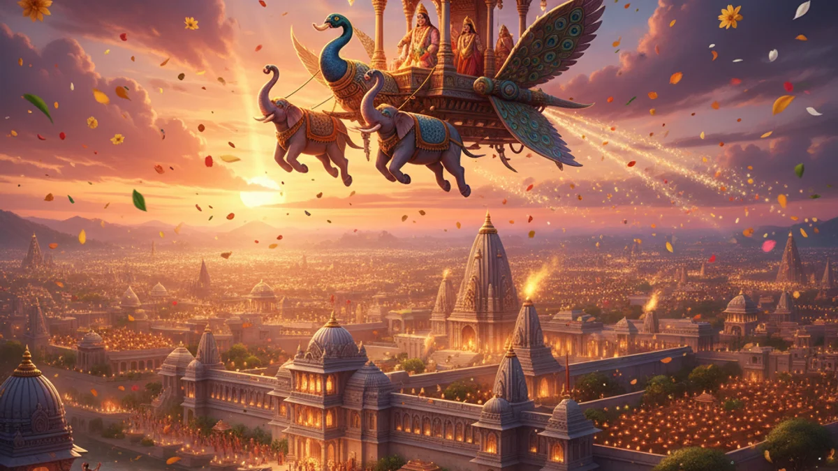 After fourteen years of exile and the climactic defeat of the demon-king Ravana, Lord Rama prepared for his journey home. Alongside his wife Sita, his brother Lakshmana, and his devoted ally Hanuman, he boarded the celestial Pushpaka Vimana. As they soared over the landscape, Rama pointed out the landmarks of their struggle and eventual victory to Sita. In Ayodhya, Prince Bharata anxiously awaited his brother's arrival, having ruled as a regent by placing Rama's sandals on the throne. To guide their king through the moonless night, the citizens of Ayodhya lined the streets with millions of clay lamps, turning the city into a sea of golden light. The air filled with the scent of flowers and the sound of joyous chants. Upon landing, Rama embraced Bharata, reuniting the family and restoring order to the kingdom. His coronation marked the beginning of Ram Rajya, an era of peace, prosperity, and justice.