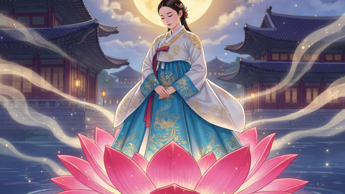 Shimcheong was the devoted daughter of Shim Bong-sa, a blind man who raised her alone after her mother’s death. To support them, Shimcheong worked tirelessly from a young age. One day, her father accidentally fell into a ditch and was rescued by a monk who claimed that if the father offered 300 sacks of rice to the Buddha, his sight would be restored. Desperate to help her father, Shimcheong struck a deal with sailors seeking a human sacrifice to appease the Dragon King of the Indangsu Sea for safe passage. She sold herself for the rice and jumped into the churning waves. However, the Dragon King was so moved by her filial piety that he protected her in a giant lotus flower and sent her back to the surface. She was discovered by the King of the land, who was enchanted by her grace and married her. As Queen, she hosted a grand banquet for all blind men in the kingdom. When her father arrived and heard her voice, his eyes miraculously flew open through the power of his immense joy and her unwavering devotion.