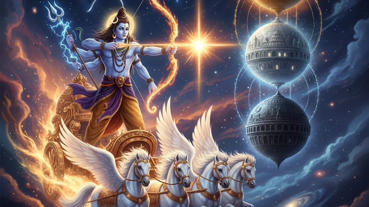 Discover the legend of Shiva Destroys Tripura. Witness how Lord Shiva used a cosmic chariot and a single arrow to demolish the three invincible demon cities.