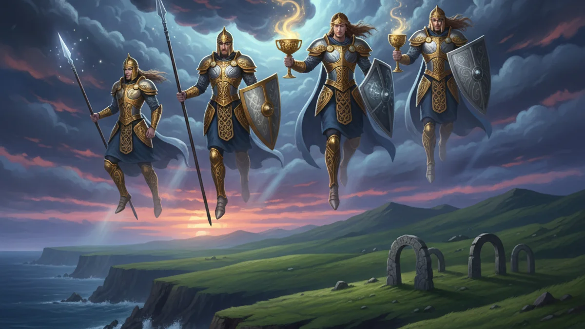 The Book of Invasions, or Lebor Gabála Érenn, chronicles the legendary history of Ireland through six successive waves of settlers. It begins with Cessair, granddaughter of Noah, who arrived before the Great Flood. After the waters receded, the land was claimed by Partholón, who introduced agriculture, and then Nemed, whose people fought the monstrous sea-raiders known as the Fomorians. Following them were the Fir Bolg, who divided Ireland into its five provinces. The most mystical wave was the Tuatha Dé Danann, a race of god-like beings who arrived in dark clouds, bringing four magical treasures. They defeated the Fir Bolg and the Fomorians in epic battles, establishing a golden age of magic and craft. However, their reign ended with the arrival of the Milesians, the ancestors of the modern Irish. Through a mix of steel and sorcery, the Milesians conquered the surface world, forcing the Tuatha Dé Danann to retreat into the hollow hills and mounds, where they became the legendary Aes Sidhe, or fairy folk of Ireland.