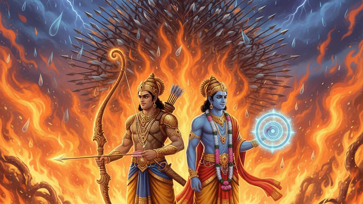 Agni, the God of Fire, suffered from a severe loss of appetite after consuming too much clarified butter from King Swetaki’s endless sacrifices. To regain his strength, Agni needed to consume the lush Khandava Forest, which was rich in medicinal herbs. However, every time he tried to burn it, Indra, the King of Gods, sent torrential rains to protect his friend Takshaka the serpent who lived there. Agni approached Krishna and Arjuna for help. Recognizing his plight, the heroes agreed. Agni gifted Arjuna the legendary Gandiva bow and two inexhaustible quivers, while Krishna received the Sudarshana Chakra. As Agni began to consume the forest, Indra attacked with clouds and storms. Arjuna created a vast canopy of arrows so dense that not a single drop of rain could reach the fire. Krishna patrolled the perimeter to ensure no creature escaped the divine consumption. Despite Indra’s fury, the forest was reduced to ashes, curing Agni. In gratitude, the architect Maya Danava, whom Arjuna spared, built the Pandavas the magnificent palace of Indraprastha.