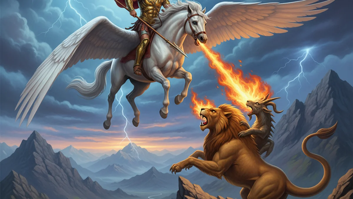 Explore the legendary Greek myth of The Chimera, a fire-breathing monster defeated by Bellerophon and Pegasus. Witness a tale of divine aid and heroic bravery.