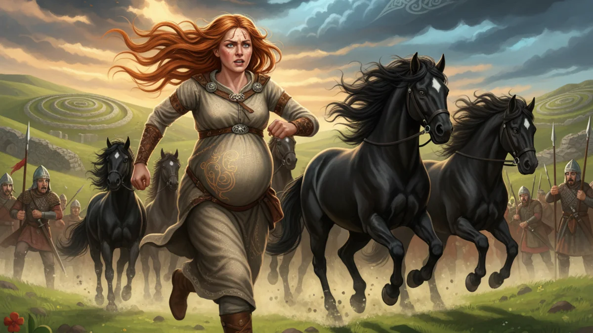 Crunniuc, a wealthy widower of Ulster, lived alone until a mysterious woman named Macha appeared at his door. Without a word, she took up the duties of his household, bringing him immense prosperity and love. She had but one condition: he must never speak of her to anyone. For a time, they lived in perfect harmony. However, at a great assembly of the Ulstermen, Crunniuc witnessed the King’s horses winning every race. Pride overcame his wisdom, and he boasted that his wife could outrun any horse in the kingdom. King Conchobar, angered by the claim, demanded Macha be brought to prove it. Despite being heavily pregnant and pleading for a delay until after her delivery, the King forced her to race. Driven by divine strength and maternal agony, Macha outran the royal steeds. At the finish line, she gave birth to twins and, in her final breath of strength, cursed the men of Ulster. She decreed that in their time of greatest need, they would suffer the debilitating pains of childbirth for five days and four nights, a curse that would haunt nine generations of warriors.