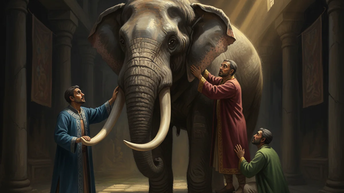 An elephant was brought to a village by some travelers from India and placed in a dark room. Curious locals flocked to see the mysterious creature, but since the room was pitch black, they had to rely on their touch. One man felt the elephant’s trunk and declared, 'This creature is like a thick water pipe!' Another touched its ear and argued, 'No, it is like a large, broad fan.' A third man, having felt a leg, insisted, 'You are both wrong; it is clearly a massive pillar.' A fourth, stroking its back, claimed it was a majestic throne. Each man was convinced of his own truth based on the fragment he had touched. Because they lacked light, they could only perceive parts, and their limited perspectives led to endless disagreement rather than understanding the magnificent whole.