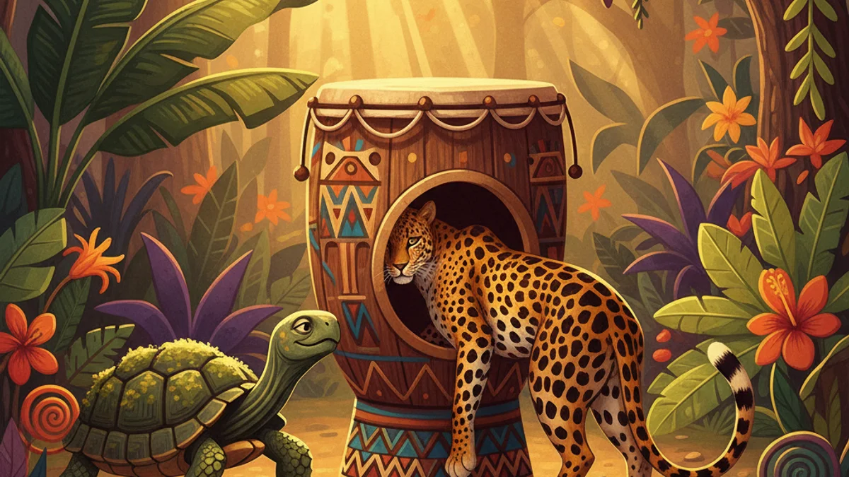 Discover the African folktale The Leopard's Drum, where a clever tortoise uses wit to outsmart a proud leopard and earn a reward from the Sky God Nyame.