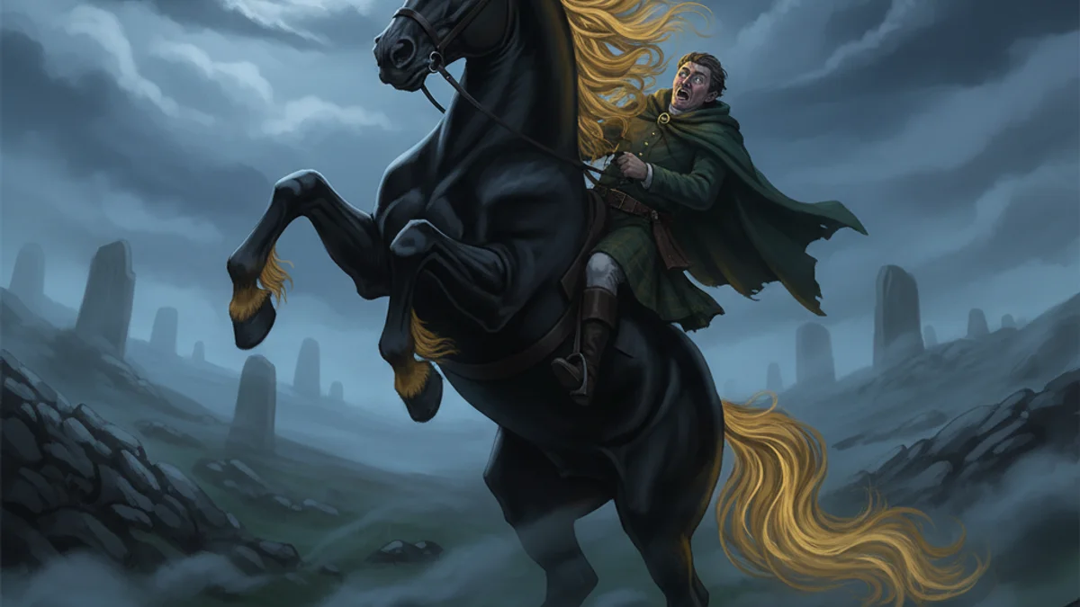 “Beware the dark horse on a moonlit path, for the Pooka’s ride has no mercy for the weary.”