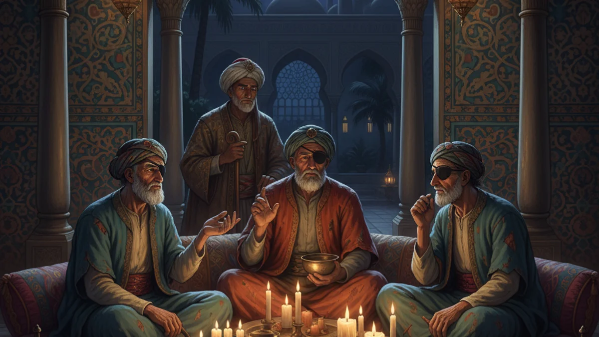 In the city of Baghdad, three one-eyed mendicants, known as Calenders, arrived at the house of three mysterious sisters. They were joined by the Caliph Harun al-Rashid and his vizier, who were traveling in disguise. The sisters agreed to host them on the condition that they ask no questions about what they saw. However, curiosity overcame the guests when they witnessed strange rituals involving two black hounds. To save their lives, the three Calenders revealed that they were actually princes who had each lost an eye through supernatural misfortune. The first prince had lost his eye to a vengeful vizier after discovering a secret subterranean tomb. The second prince was transformed into an ape by an Ifrit and later lost his eye during a magical duel between a princess and the demon. The third prince found a palace of forty doors; he opened the forbidden fortieth door and was carried by a mechanical horse that struck out his eye as he fled. Moved by their tragic tales of fate and forbidden curiosity, the Caliph revealed his true identity, pardoned the household, and restored the princes to their rightful status.