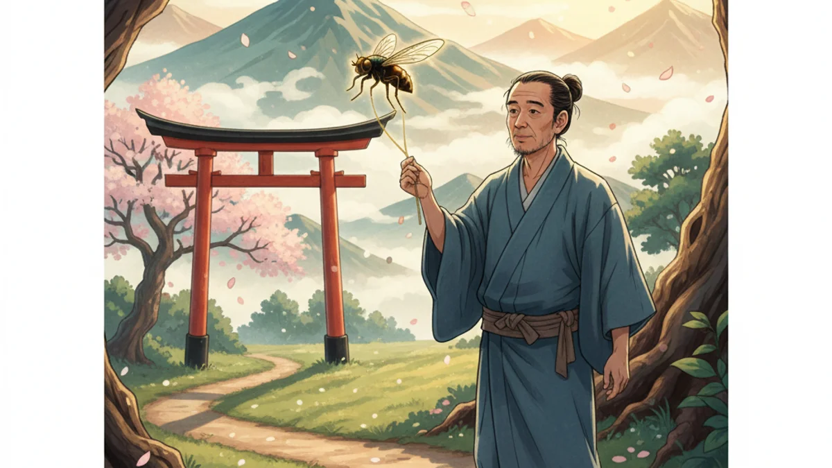 Long ago in Japan, a destitute man prayed to Kannon, the Goddess of Mercy, for relief from his poverty. Kannon spoke to him in a dream, telling him to leave the temple and keep the very first thing his hand touched upon the ground. As he stepped outside, he tripped and his hand landed on a single piece of straw. Though it seemed worthless, he remembered the Goddess's words and kept it. While walking, a horsefly began buzzing around him; he caught it and tied it to the straw. A crying child saw the toy and stopped weeping; in gratitude, the child's mother gave the man three oranges. Later, he met a thirsty noblewoman who was fainting in the heat. He offered her his oranges for refreshment, and she rewarded him with three bolts of fine silk. Further down the road, he encountered a samurai with a dying horse. He traded his silk for the horse, nursed it back to health, and eventually traded the strong animal to a wealthy landlord for a field and a house. Through a sequence of selfless gestures and divine luck, the man who started with nothing but a straw became a wealthy and respected landowner.