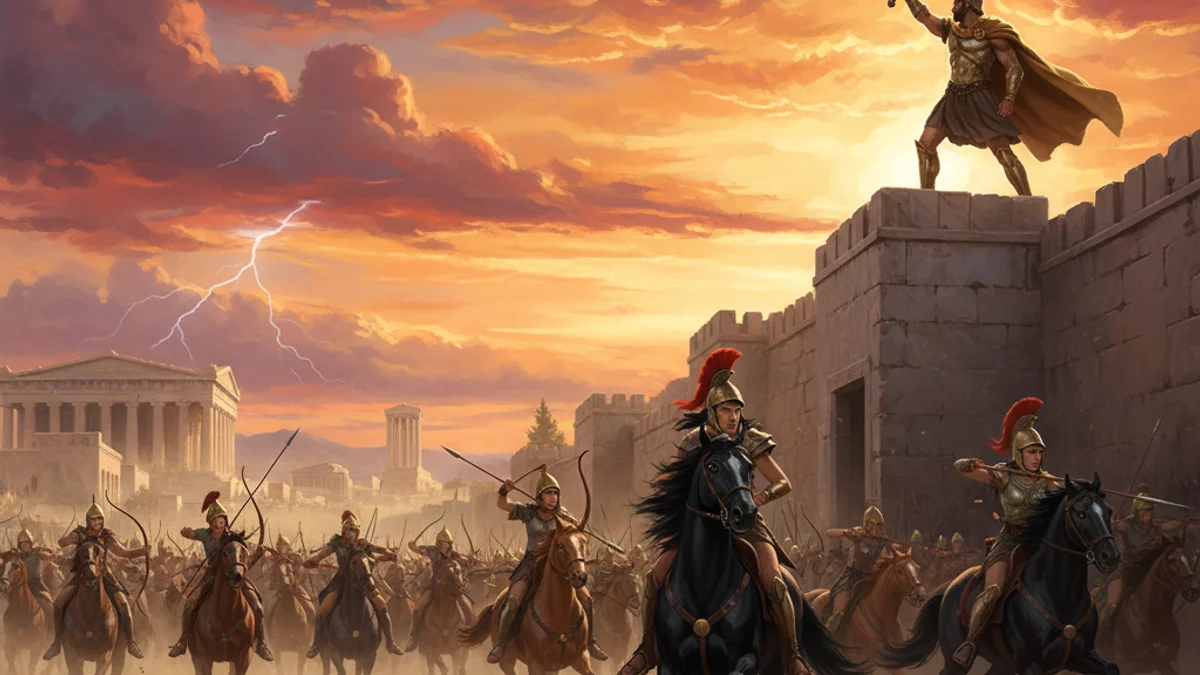 Seeking new glory after his victory over the Minotaur, Theseus sailed to the distant shores of Themiscyra, the land of the warrior Amazons. He was greeted by their queen, Antiope, who was intrigued by the Athenian hero. However, the meeting turned to conflict when Theseus abducted the queen and brought her back to Athens—though some accounts suggest she fell in love and joined him willingly. Outraged by this perceived insult and the loss of their leader, the Amazon army pursued them across the seas. They launched a massive invasion of Attica, leading to the legendary 'Amazonomachy,' a brutal siege of Athens itself. For months, the city was locked in a bloody struggle as the fierce warrior women fought to the very foot of the Acropolis. Only after great loss of life and a desperate defense did Theseus manage to repel the invaders. A peace treaty was finally brokered, but the cost of the conflict remained a somber reminder of the consequences of prideful provocation.