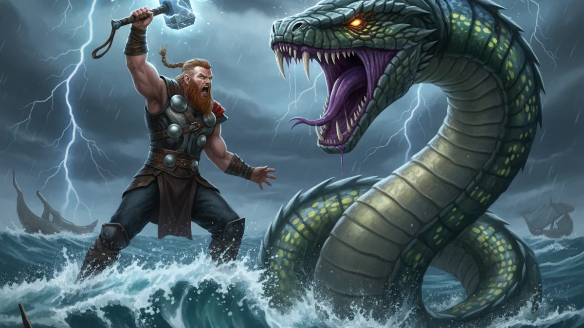 Thor fights Jörmungandr, also known as the Midgard Serpent, a monstrous offspring of Loki that is large enough to encircle the entire world.