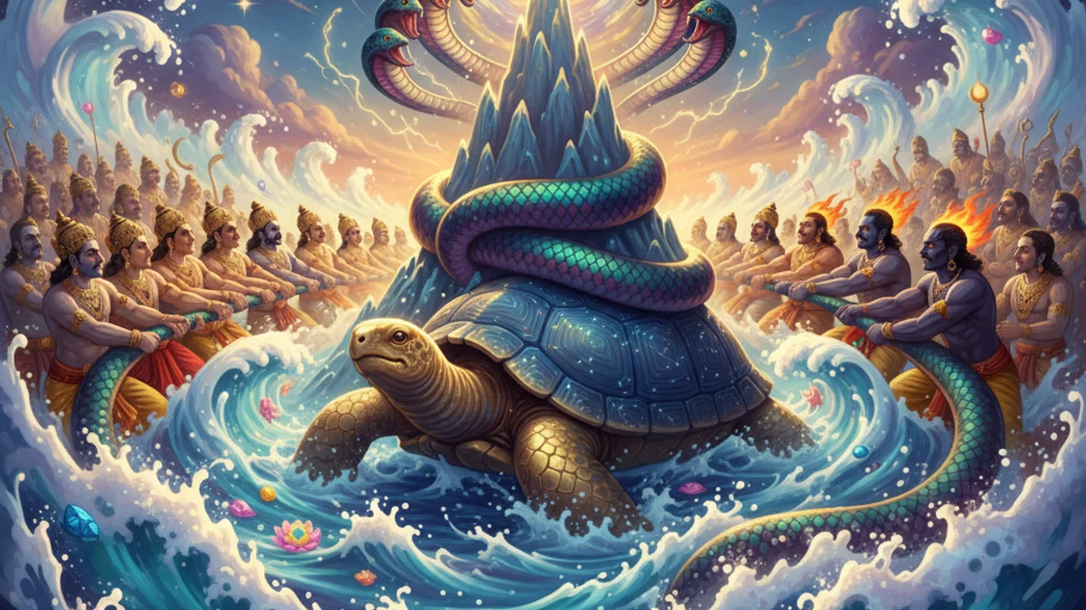 Long ago, the Devas lost their divine strength due to the curse of the quick-tempered Sage Durvasa. Seizing this weakness, the Asuras gained control of the three worlds. To regain their power, Lord Vishnu advised the Devas to churn the Ksheera Sagara, the Ocean of Milk, to obtain Amrita, the nectar of immortality. Realizing the task was too monumental to achieve alone, the Devas formed a temporary alliance with the Asuras. They used Mount Mandara as the churning rod and the great serpent Vasuki as the rope. However, as the churning began, the heavy mountain lacked a base and started sinking into the soft ocean floor. To save the mission, Lord Vishnu assumed the form of Kurma, a colossal tortoise. He dove to the depths of the ocean and supported the mountain on his vast, impenetrable shell. With this stable foundation, the churning continued for years, eventually yielding many divine treasures, including Goddess Lakshmi and the precious Amrita, which allowed the Devas to restore balance to the universe.