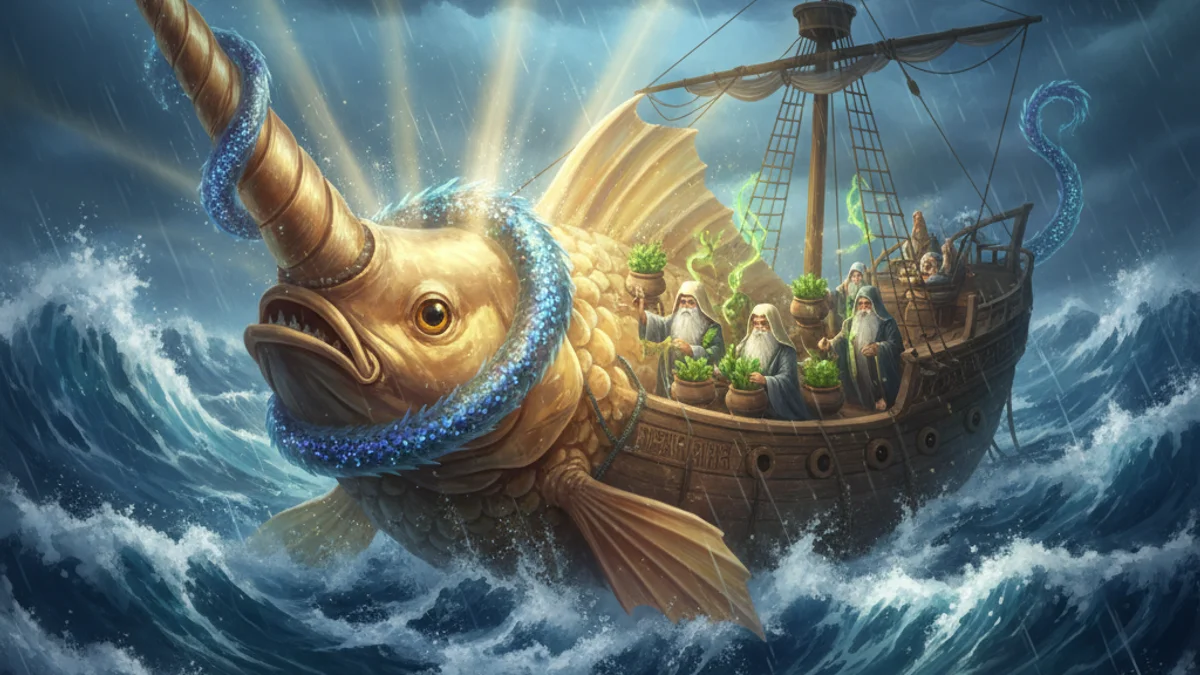 King Satyavrata was performing his morning prayers by the river when a tiny fish swam into his palms, pleading for protection from larger predators. Moved by compassion, the king placed the fish in a jar. By the next morning, the fish had outgrown the jar. He moved it to a pond, then a river, and finally the ocean, yet the fish continued to grow at a miraculous rate. Realizing the creature was divine, Satyavrata bowed. Lord Vishnu revealed himself and warned that a great deluge would destroy the world in seven days. He commanded the king to build a massive ship and gather the seven celestial sages, medicinal herbs, and seeds of every living thing. When the storm arrived, Vishnu appeared as Matsya, a golden, one-horned fish. Using the serpent Vasuki as a rope, Matsya tethered the ship to his horn and guided the survivors through the dark, turbulent waters, preserving life and the sacred Vedas for the next cycle of creation.
