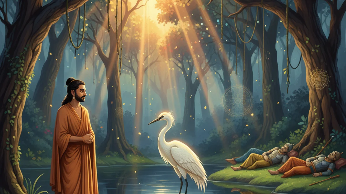 During their twelve-year exile, the Pandava brothers grew exhausted and thirsty in the forest of Kamyaka. Yudhishthira sent Sahadeva to find water, who discovered a beautiful lake. As he prepared to drink, a voice from a Crane perched nearby warned him: 'Answer my questions first, or you shall perish.' Sahadeva ignored the bird, drank, and fell dead. One by one, Nakula, Arjuna, and Bhima followed; all ignored the warning and collapsed. Finally, Yudhishthira arrived to find his brothers lifeless. Though heartbroken, when the Crane spoke, Yudhishthira listened with humility. The Crane, who was actually a Yaksha, asked many profound riddles: 'What is faster than the wind?' 'The mind,' Yudhishthira replied. 'What is more numerous than grass?' 'The thoughts in a man's heart.' Satisfied with his wisdom, the Yaksha offered to revive one brother. Yudhishthira chose Nakula, his step-brother, explaining that his own mother, Kunti, still had a son (himself), so his step-mother Madri should also have one. Impressed by this supreme sense of justice, the Yaksha revealed himself as Dharma, the God of Righteousness and Yudhishthira's father, and restored all the brothers to life.