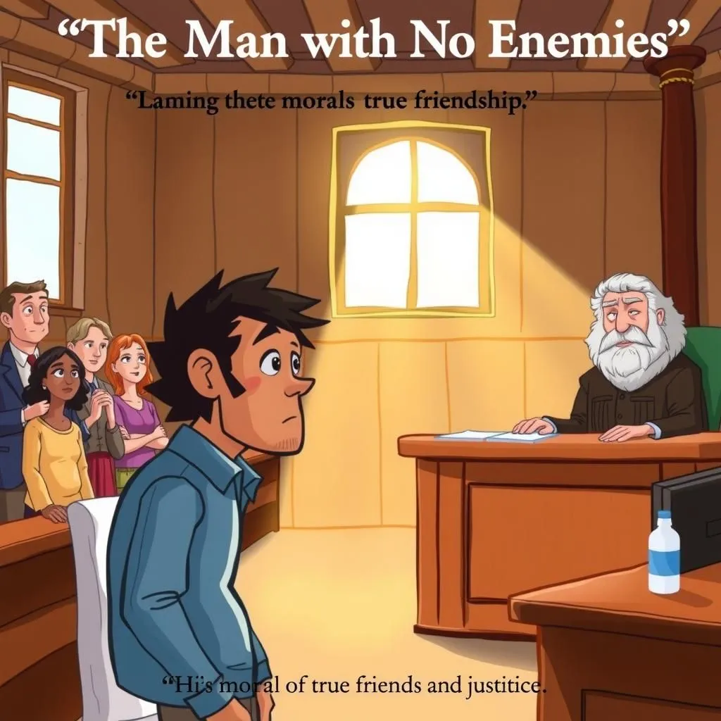 "ది మ్యాన్ విద్ నో ఎనిమీస్" లో, ఒక నిరుపద్రవ వ్యక్తిని ఒక అపరిచితుడు క్రూరంగా దాడి చేస్తాడు, దీని వలన ఒక విచారణ జరుగుతుంది, అక్కడ అతను తనకు శత్రువులు లేరని పేర్కొంటాడు. ప్రతివాది ఈ శత్రువుల లేమే దాడికి కారణమని వాదిస్తాడు, ఇది న్యాయమూర్తిని ఒక హాస్యాస్పదమైన కానీ నైతిక పాఠంతో కేసును తిరస్కరించడానికి ప్రేరేపిస్తుంది: శత్రువులు లేని వ్యక్తికి నిజమైన స్నేహితులు ఉండరు, అందువల్ల అతను కోర్టులో న్యాయం కోరకూడదు. ఈ చిన్న కథ విద్యార్థులకు సంబంధాల సంక్లిష్టత మరియు వివాదాల స్వభావం గురించి ఆలోచనాత్మక నైతిక పాఠంగా ఉపయోగపడుతుంది.